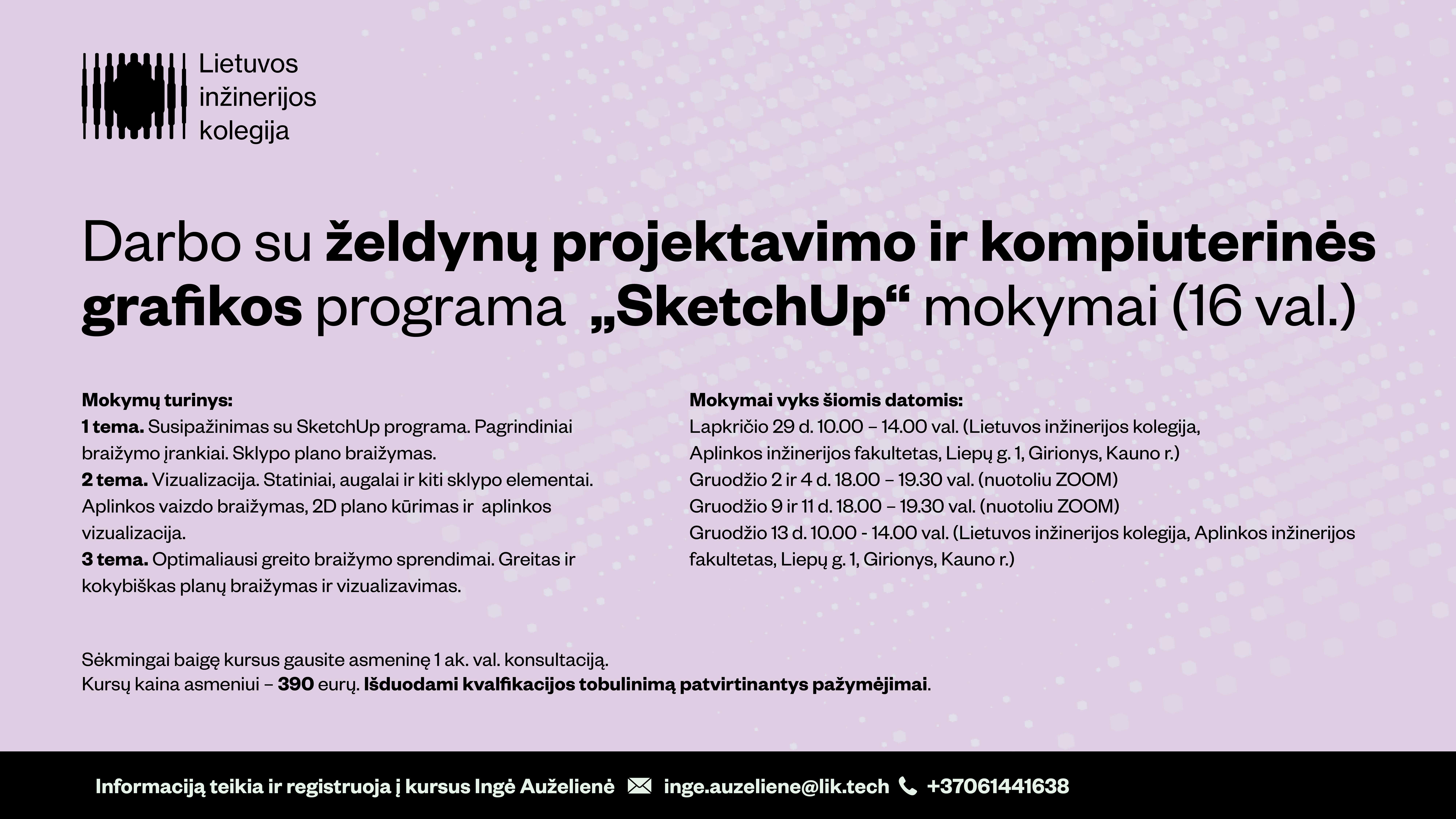 Informaciją teikia ir į kursus registruoja Ingė Auželienė, el.paštu inge.auzeliene@lik.tech arba tel. 061441638