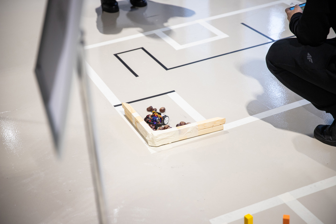 Track 1 was a speed challenge where the teams had to complete the track as fast as possible without failing. Students had to pick up a small object and carry it to the assigned place while competing on track 2. Track 3 had a similar challenge just the objects to be picked up were chestnuts: this track was one of the most complicated one for the students to finish. Finally, track 4 was once again a speed challenge: the students had to complete it as fast as possible without crossing any lines or leaving the track.