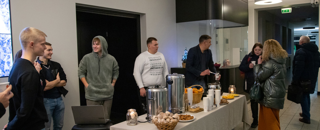 Studentų atstovybės nariai, jaukios kalėdinės atmosferos apsuptyje, visus kolegijos narius vaišino šiltais gėrimais ir šventiškais užkandžiais.